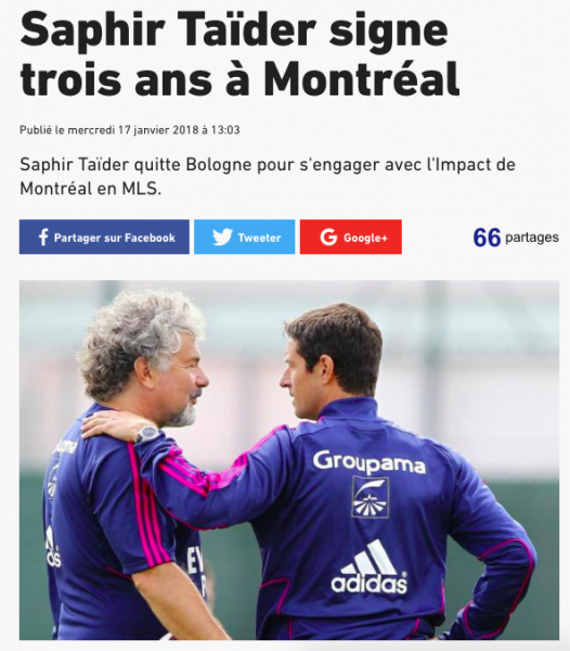 Confirmé par France Football puis par L'Équipe, on peut désormais affirmer que le milieu de terrain algérien Saphir Taider s'est entendu avec l'Impact de Montréal.