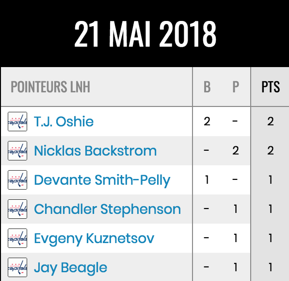 T.J. Oshie, pour sa part, y est allé d'un doublé. Un autre joueur des Caps qui est taillé pour les séries éliminatoires. Le capitaine des Rouges, lui, n'a pas marqué, mais il a été impliqué dans toutes les facettes du jeu, malgré qu'un Lightning traîne toujours dans ses pantalons.