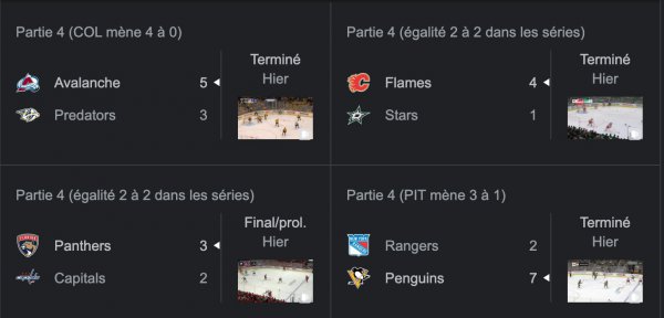 Il y avait quatre matchs de première ronde à l'affiche hier soir dans la LNH. Voici les résultats finaux: