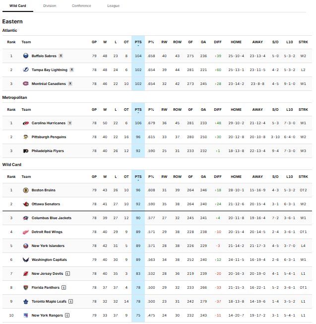 Avec leur victoire, les Sabres s'éloignent du Canadien au classement dans l'Atlantique. Ils ont maintenant 104 points, seuls au premier rang de la division (mais avec un match de plus que le Lightning et le CH) :