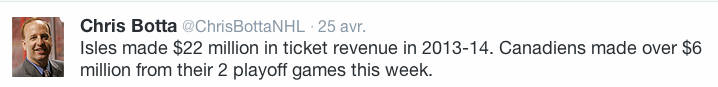 – Les Islanders de New York ont ramassé 22 millions $ (en billets vendus) en saison régulière… Le Canadien, lui, a déjà 6 millions $ de ramassés, en une ronde éliminatoire! #2MatchsAuCentreBell LIEN