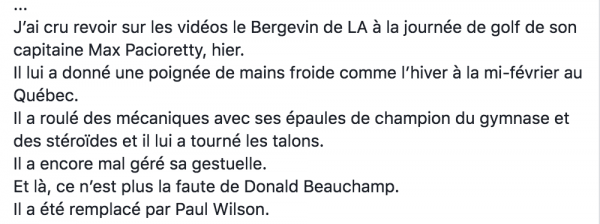 J'ai cru revoir sur les vidéos le Bergevin de LA à la journée de golf de son capitaine Max Pacioretty, hier. Il lui a donné une poignée de main froide comme l'hiver à la mi-février au Québec. Il a roulé des mécaniques avec ses épaules de champion du gymnase et des stéroïdes et il lui a tourné les talons. Il a encore mal géré sa gestuelle. Et là, ce n'est plus la faute de Donald Beauchamp. Il a été remplacé par Paul Wilson.