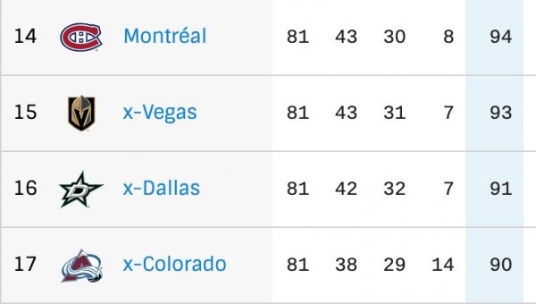 Et ne nous cachons pas la tête dans le sable, le Canadien figure au 14e rang total de la Ligue nationale avec ses 94 points (avant le match de ce soir). Ça reste une commande colossale dans une conférence de l'Est très relevée. Dites-vous que l'Avalanche du Colorado accédera aux éliminatoires avec moins de points en banque que le Canadien. D'ailleurs pas moins de trois équipes de l'Ouest ont récolté moins de points que le Canadien et celles-ci ont confirmé leur place en séries.