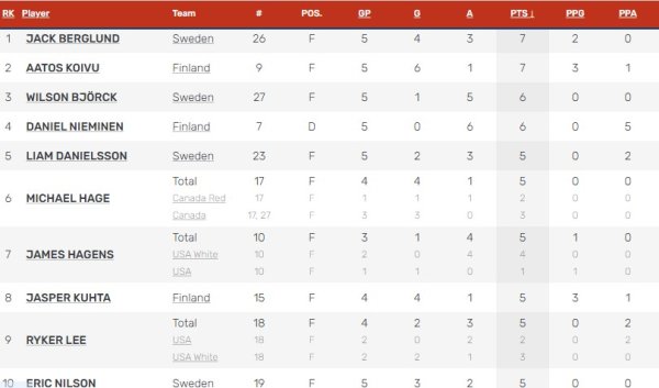 Michael Hage, quant à lui, a terminé le tournoi dans le top-5 des meilleurs pointeurs avec ses cinq points, dont quatre buts, en quatre matchs.